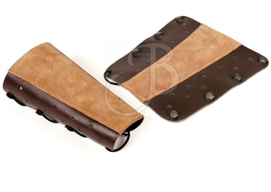 Dieser handgefertigte traditionelle Armschutz wurde aus zwei verschiedenen und farblich zueinander gut abgestimmten Ledersorten gefertigt. Der Verschluss erfolgt durch ein Lederband. Durch die eingebrachten Stanzungen soll eine Ventilationswirkung erreicht werden.