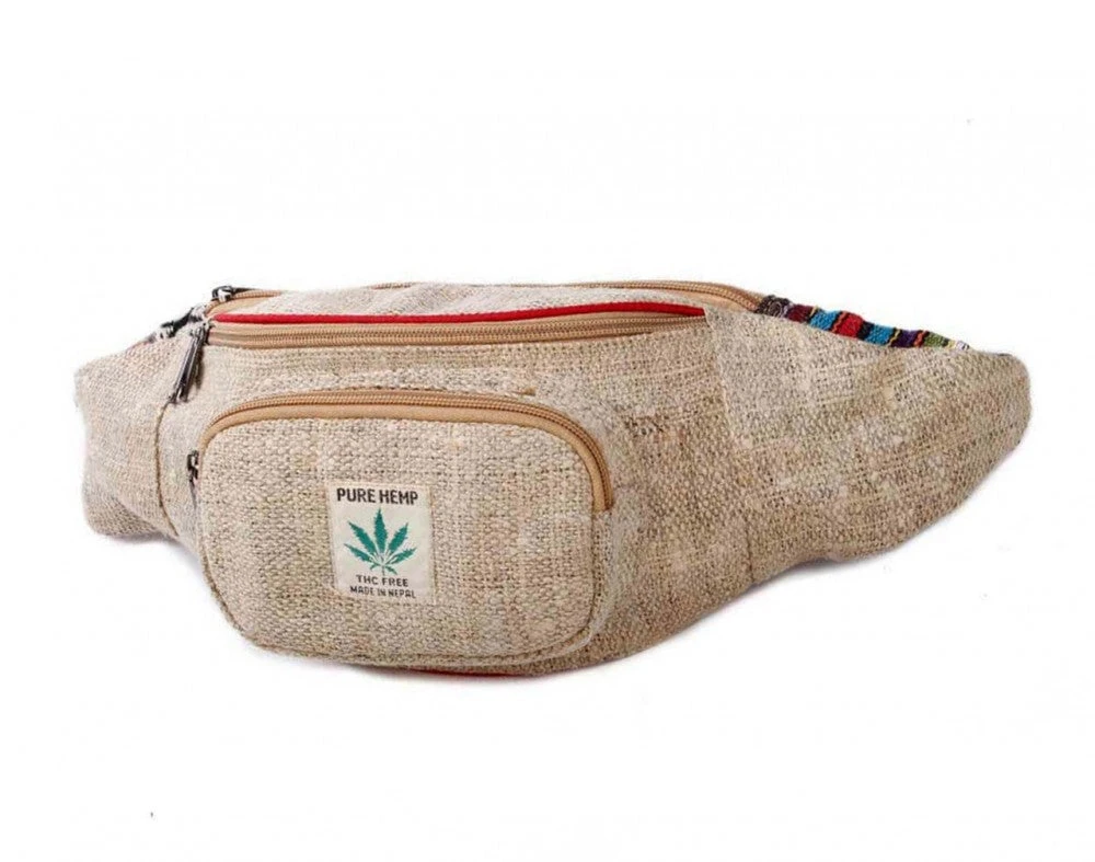 Die Tasche hat drei Außenfächer mit Reißverschluss. Die Gürteltasche wurde in Handarbeit aus natürlichem Hanfpflanzen erstellt.