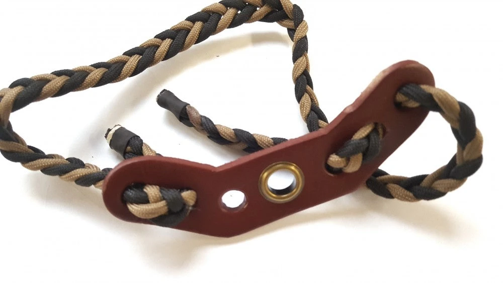 Geflochtene Bogenschlinge mit Ledergurt, welche in der aufgerichteten Position verbleibt. Passend für jede Hand und jedes Griffstück.