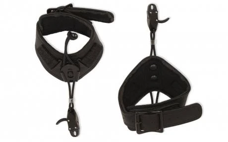 Zangenrelease mit Befestigung an einer Handgelenkschlaufe. Das Release wird mühelos mit dem Zeigefinger ausgelöst (am Hebel). Die Verwendung ist sowohl für den RH- als auch den LH-Schützen möglich.