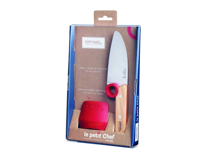 Früh übt sich derjenige, der ein Meisterkoch werden will. Gut ausgestattet ist der Küchennachwuchs mit dem Opinel-Set „Le petit Chef“. Im Set enthalten sind ein Messer mit abgerundeter Klingenspitze, sowie ein Kunststoff- Fingerschutz, der Verletzungen beim Arbeiten vorbeugt. Ein weiteres Sicherheitselement stellen die Fingerringe am Messer dar, die einem unbeabsichtigten Abrutschen beim Umgang mit den Geräten vorbeugen. Das Messer verfügt über eine rostfreie Edelstahlklinge und einen Opinel- typischen Buchenholzgriff