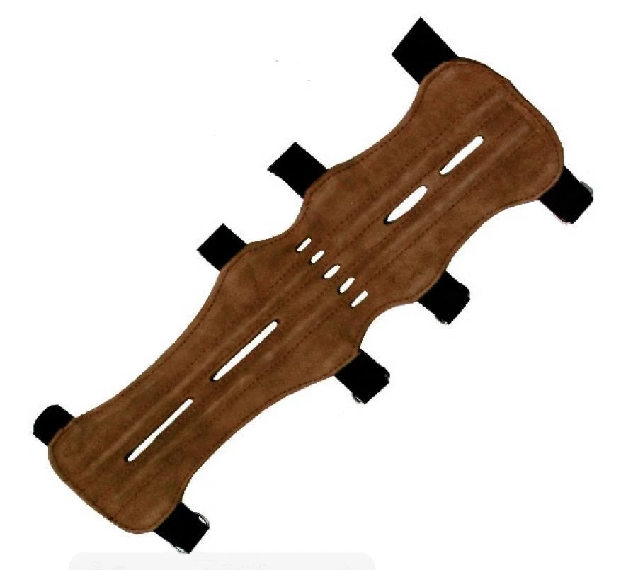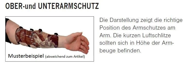 Langarmschutz mit einer Lederdeckschicht. Der Armschutz wurde mit Stabilisierungsstreben durchgezogen und mit Luftschlitzen ausgestattet. Aufgrund der langen Klettverschlüsse kann der Armschutz gut am Arm angepasst werden.